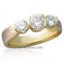 This contemporary three stone engagement ring has semi-bezel settings for round diamonds or gemstones. The bezels graduate in size and connect to a band with a uniform width.Shown in 14k rose gold with a 6mm round diamond center and 4mm round diamond side stones.