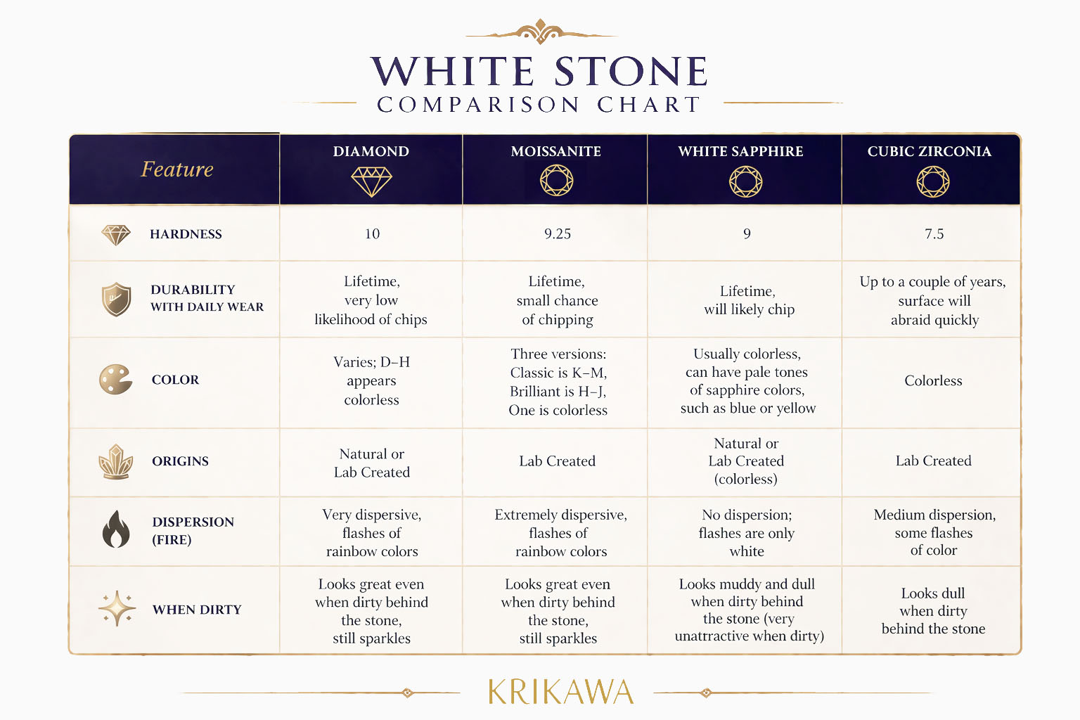While there are a few naturally occurring white stones, Krikawa highly recommends white sapphire as the top natural alternative to diamonds. It provides a classic, colorless look with a few considerations: