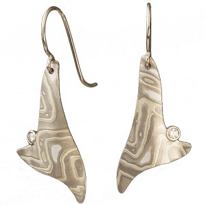 These organic earrings' shape evoke the aquatic manta ray. A sheet of mokume gane of your choice is cut out and accented with a diamond.