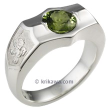 A unique band for a wedding or just everyday. Hand-engraved by a master engraver with your own crest. The center stone is flush set. Tapers from 13mm to 5mm at the palm.