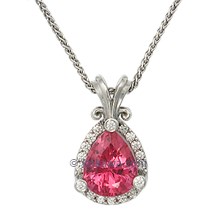 This gemstone pendant features a pear cut 4.29ct pink spinel center stone surrounded by a halo of white diamonds. The bail is a signature Krikawa Curls bail. The pendant was done in 14k white gold.