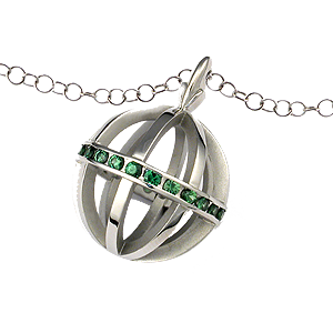 The earth represents the classic elements of nature: land, air, fire and water. The three-dimensional pendant is channel set with a band of 0.72 ctw tsavorites (green garnets) around the equator.