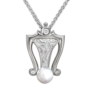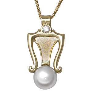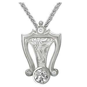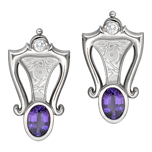 This elegant pendant features an oval purple sapphire and inlaid white mokume.
