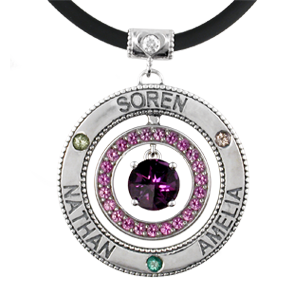This personalized pendant has four family members' names, and the birthstones pink tourmaline, citrine, alexandrite and diamond.