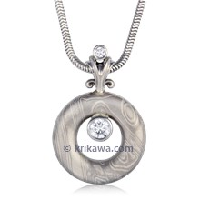 This pendant features a doughnut shaped piece of mokume with a diamond at its center. A bail with curls is accented with another diamond. Shown with but priced without chain.