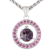 This pendant has a circle of 0.34 ctw paved pink sapphires and a 6.5mm Four Peaks Arizona amethyst. 14K white gold. Chain not included in price.