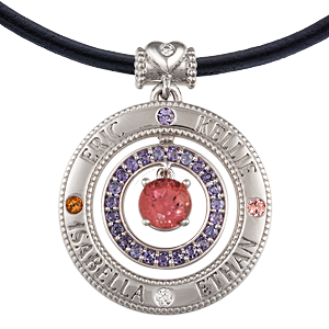 Show your love for your family with this personalized pendant! Customize with the names of children and birthstones, as well as the parents' birthstones. Suspended inside the circle is a ring of paved gemstones and a larger 6mm gemstone.Sterling Silver Pricing: