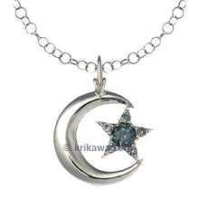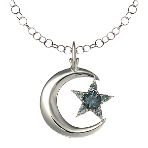 Widely accepted as the symbol of the Islamic faith, the Star and Crescent is associated with the moon's movements to coordinate religious festivals. With bluish green Montana sapphires. Price does not include chain.