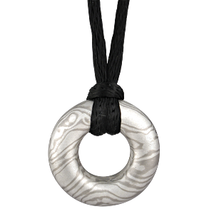 This unusual pendant is made of 14K rose gold, with Trigold mokume gane in a matte finish. Comes with a black silk cord, but other options are available for purchase.