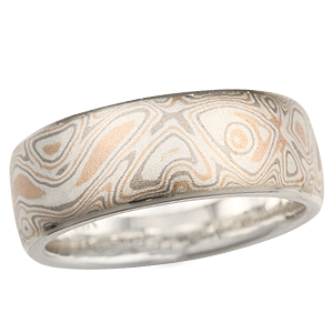 This petite Champagne Mokume Wedding Band was handcrafted with a 14k rose gold liner and measure 4mm in width.
