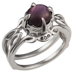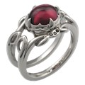 This Alien Scaffolding Engagement Ring and black diamond wedding band was a Top Ten Finalist in the Ultimate Design Contest and on view at the SMART Jewelry Show in Chicago. The focal point of the Alien is a 2.78 ct (9x7) rhodolite cabochon. 0.63 ct diamond band. Size 7.5. Palladium.