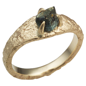 This ring evokes a regal find from an archaeological dig! The textured surface of the band and prongs can be plated to appear rustic. Despite the rugged appearance, this ring is still comfort-fit and easy to wear like all our creations.Shown in white gold with rose gold plating, and a 3mm rough blueish green sapphire.