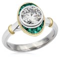 Shown in platinum with a 1.5 carat diamond center and custom-cut emerald accents.