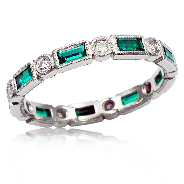 This petite wedding band is bursting with sophisticated details. The alternating diamond and gemstone shapes create a vintage, lace-like design that encircles your finger and enhances your engagement ring. The stones alternate between round and baguette cut with hand-rolled millegrain details wrapping each stone. Pictured here with round diamonds and baguette blue sapphires, imagine this ring in your choice of two stones or keep in classic in all diamond!