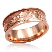 Capture your love story with personalized wedding bands that reflect your journey. Each band is handmade and tailored to include the landscapes and symbols important to you. Your favorite places, special moments, and personal symbols are woven into a unique design that wraps around your finger, telling your story in a meaningful way.