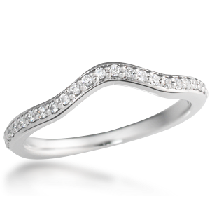 Create a beautiful curved wedding band for your engagement ring. This contoured wedding band has bead-set diamonds protected by rails, for a more modern look. The stones are only across the top half of the ring.Choose a precise contour for a shadow band that hugs every nook and cranny of your engagement ring with no gaps, or go with a gentle contour for a wedding band that curves around your engagement ring with soft, flowing curves.