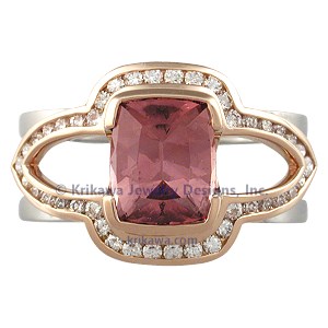 A 2.06 ct cushion cut cognac spinel is the center piece of this scaffolding engagement ring. It is surrounded by 1.4 mm diamonds. This two-tone ring consists of 18K rose gold and palladium.