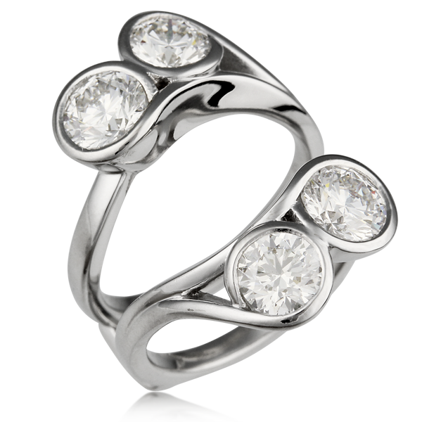 The Bubble Wave Engagement Ring is a love story in motion. Inspired by flowing water and the rhythm of connection, this three stone design curves and swirls like waves drawn by the pull of the moon. Each gem represents a moment, past, present, and future, wrapped in bezels that feel like tides gently rising to meet one another.