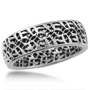This Carbon Wedding Band measures 9mm in width and was done in 14k rose gold. You can really appreciate the intricately layered organic pattern encircling the band.