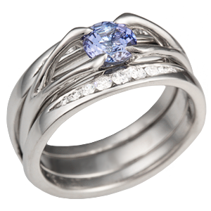This handmade Carved Branch Engagement Ring is set with a round blue sapphire. It has been paired with a Diamond Channel Eternity Wedding Band.
