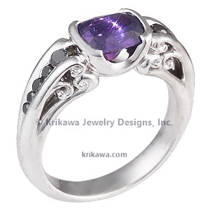 This Baroque-inspired engagement ring includes cascading waves of delicately sculpted curls. Centered is a beautiful stone of your choice mounted in a semi-bezel setting. Strands of accent stone trace the outline of the ring’s profile. This exquisite style is timeless yet unique with its craftsmanship. The band is 3mm width at the palm.Shown in platinum with purple sapphire and black diamonds.