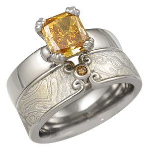This Carved Leaf Engagement Ring has an eye-grabbing radiant-cut cognac diamond as its center stone.