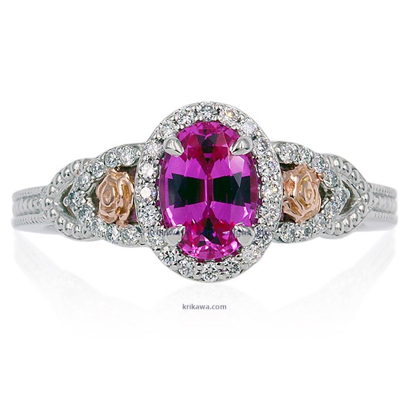 Shown in platinum and 14k rose gold with 1-carat oval sapphire.