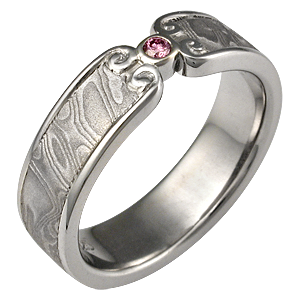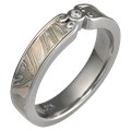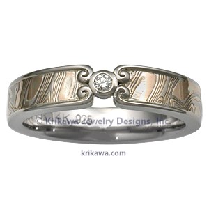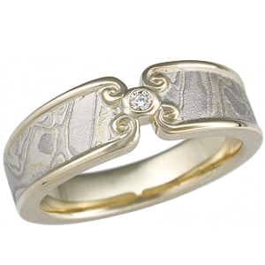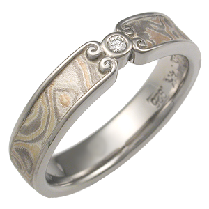 This one-of-a-kind wedding band is inlaid with Champagne mokume. It has a high polish finish.