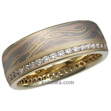 This Champagne mokume wedding band has a rose gold liner, is 7mm wide and has moissanite.