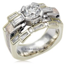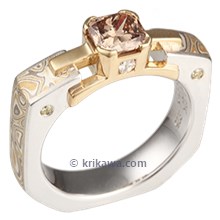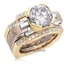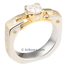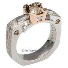 This ring was handcrafted in palladium with our Champagne Mokume Gane inlaid into the band. The bezel was done in 14k yellow gold for a beautiful, two-tone ring. The center stone is a large 3.60ct round cut diamond, Tying together the warm and cool tones in the band are white diamond and yellow sapphire accents. The band measures 5mm.