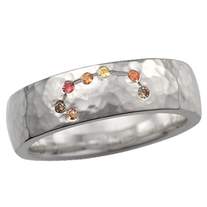 Personalize this wedding band with you and your partner's astrological constellations. The stars will be represented by the colored diamonds for sparkle and durability!For the finish, choose high polish, brushed, or hammered.