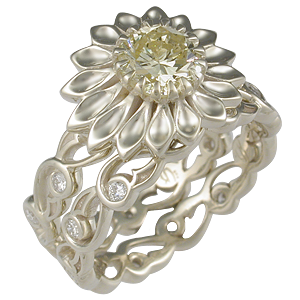 If you are interested in our Delicate Leaf rings and are looking for something elaborate, this may be the design for you. This artistic engagement ring has a daisy for a bezel! Your diamond or precious gemstone will be at the center of the blossom. Ideal cut diamonds or colored gemstones accent the band.