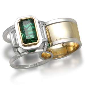 This architectural ring can be set with the stones of your choosing. Price does not include any stones. The ring is shown here set with a beryl and trapezoid diamonds.