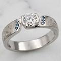 Smooth and curvaceous, this engagement ring contours to the center stone. Two waves of blue diamonds flow around the center stone and follow the curves in the band. The mokume gane band tapers down towards the palm for a comfortable feel, and the center stone is flushed with the band for a snag-free design.