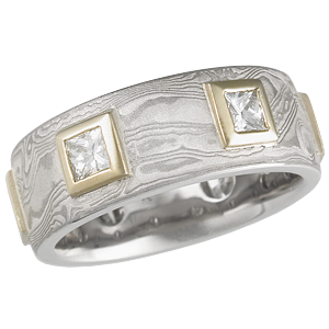 This is the deluxe version of the Mokume King's Crown Wedding Band. Six princess cut diamonds (2.7ctw) encircle this "crown." 8mm wide.Diamonds priced separately; please contact us for a quote!