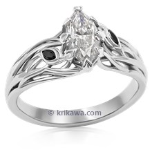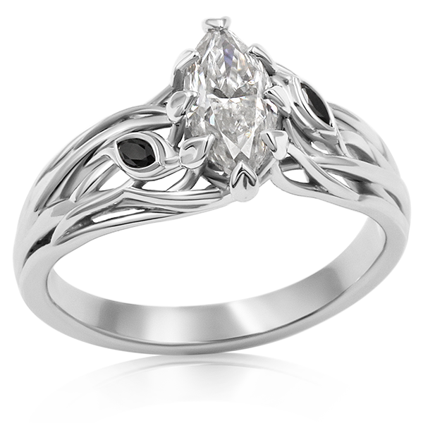 A lovely evolution of our Embracing Tree Branch Engagement Ring, this organic design features brilliant diamond leaves suspended atop the climbing branches that make up the band. The marquise-cut diamond leaves sit at natural angles on both sides of the prong-set center stone.