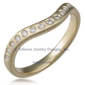 This contoured wedding band was designed for the Diamond Orbit Engagement Ring. Shown in 2.5mm, flat cross section, 14k yellow gold and white diamonds.