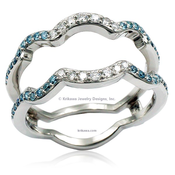 Playfully embrace your Dolphin Kiss Engagement Ring with this customizable enhancer. The scalloped design mimics the waves of the ocean, creating the perfect home for your hand-crafted dolphins and exquisite gemstones. Pave stones trace the outlines, shimmering like the waves at sunset along a tropical shoreline. Imagine your favorite colors and gems for your wedding set.Does not include the Dolphin Kiss Engagement Ring, the price only includes an enhancer.