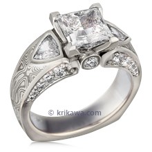 This luxurious engagement ring was done in 14k white gold and features a 2 carat princess cut diamond center stone in a four prong setting. Two trillion cut diamonds frame the center stones and point down towards the White Mokume Gane band. Pave diamonds taper down the sides of the band from carved curls and a surprise stone that sits below the center stone.
