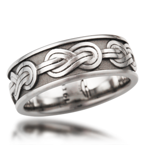 Small and delicate with a playful charm, this knot-style engagement ring is inspired by the sprightly mythical creatures of lore. The solid band splits into several rope-like bands to form inter-weaving branches that climb towards the center stone in an intricate knot design. Beneath the center stone cathedral setting are two secret side stones. The band is 2.5mm width at the palm.Shown in platinum with a one-carat pink sapphire heart center.