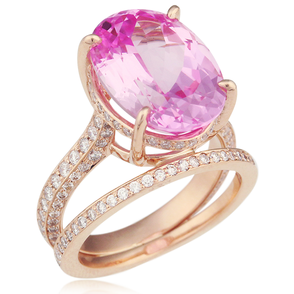 Shown in rose gold with a two-carat pink sapphire cushion.