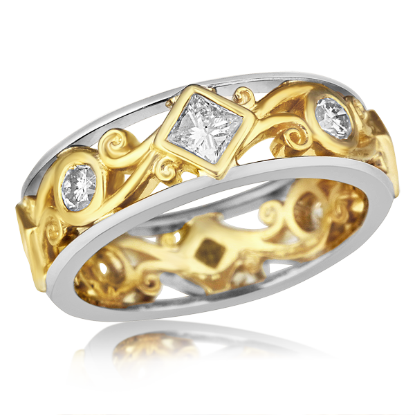 With shimmer and curves, this ring is an extravagant work of art. Repeating infinity symbols have jewels adorned on their curves. Pave stone embellished rails twist around your finger with a unique silhouette. A kite setting is the pies de résistance of this one-of-a-kind engagement ring.Shown in platinum with a princess diamond.