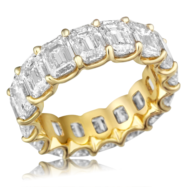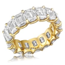 A statement of luxury and design, this eternity diamond wedding band features emerald cut diamonds channel set around the band. This contemporary style showcases the smooth, clean lines of both the stones and the band. A comfortable, snag-free design, this ring is perfect for the modern woman on the go!