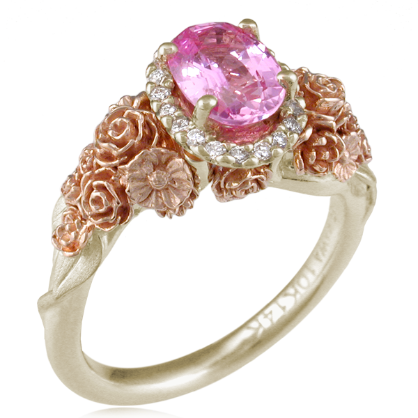 Shown in 14k rose gold and 10k green gold, with 1-ct oval sapphire and diamond accents.