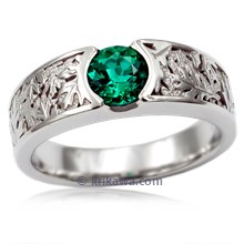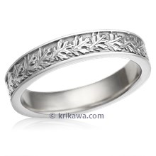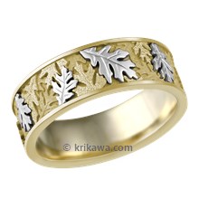 Inspired by the beauty of nature, this engagement ring features our popular oak leaves that layer in relief and cover the entire surface of the band. Evoking long, romantic walks in the woods, this ring is both modern and organic. The solitaire stone sits flush within the band for a comfortable, snag-free design that is perfect for the active person.