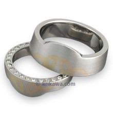 The subtle contrast of precious metal colors make for a unique wedding ring set. 18K yellow gold and 14K rose gold symbols are etched in platinum. Flush set diamonds encircling the side of her wedding ring adds a hint of sparkle. In platinum with a high polish.