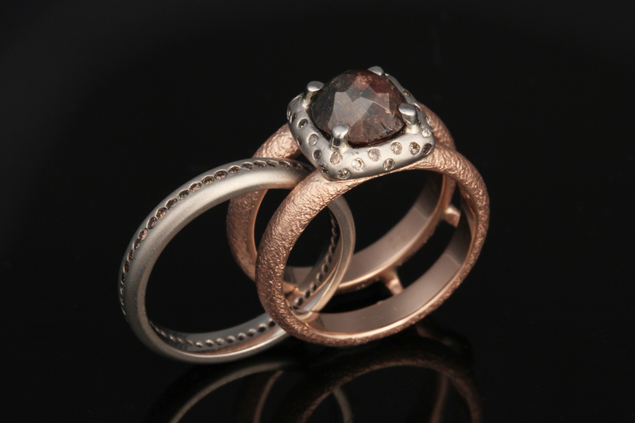 This ring takes its namesake from looking mysterious, antiquated, and otherworldly. Two textured bands are connected by scaffolding, and allow for a wedding band to slip inside. A flat-based stone sits in a diamond-accented setting. Can be ordered two-tone as shown, or in one metal.Shown in rose gold and natural white gold, with a rose cut red garnet center.