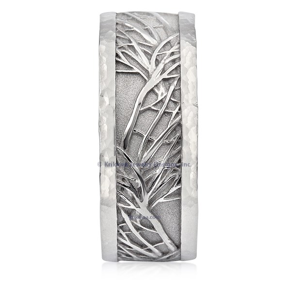 The Hammered Rail Tree of Life Wedding Band is a grounded yet graceful symbol of lasting love. Framed by hand-hammered rails, the center band features raised, polished branches reaching skyward, representing growth, strength, and connection. The recessed background creates visual depth, with a soft matte finish that echoes the natural world.