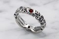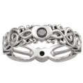 This wedding band consists of stylized treble clefs and a music staff. Four black diamond music notes (or the gemstone of your choosing) are embedded in hearts. 5mm wide.
