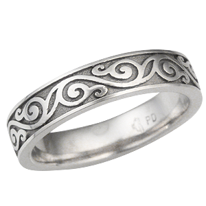 This eternity-style wedding band has stylized infinity and leaf symbols.